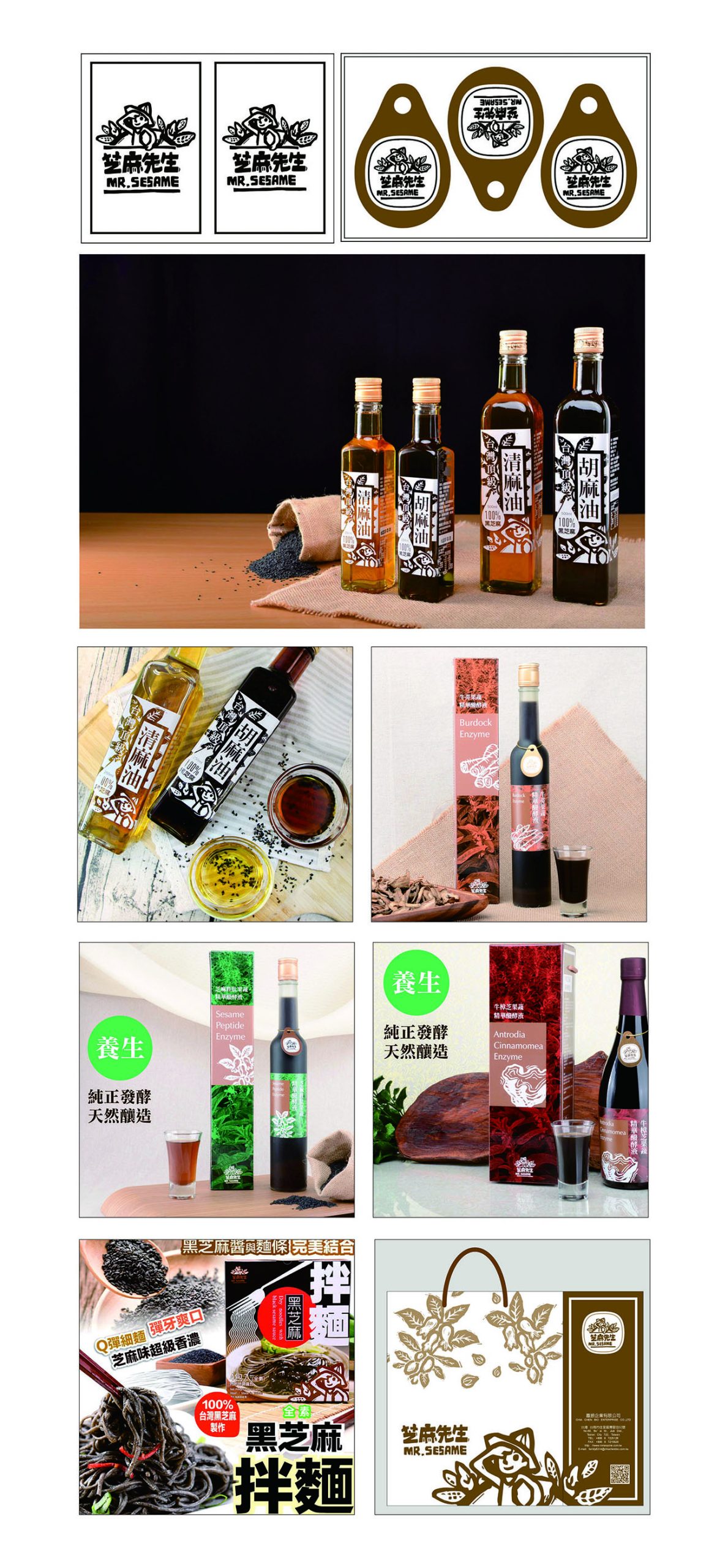 以天然(芝麻)、樂活、養生為食品事業核心,產地嚴選契作芝麻、生計技術營養加值,積極創新研發兼具風味和養生保健的芝麻產品。本案在於強化手繪視覺與系列產品的視覺應用,讓品牌深入記憶,那一束束芝麻矗立在田埂間,是豐收。